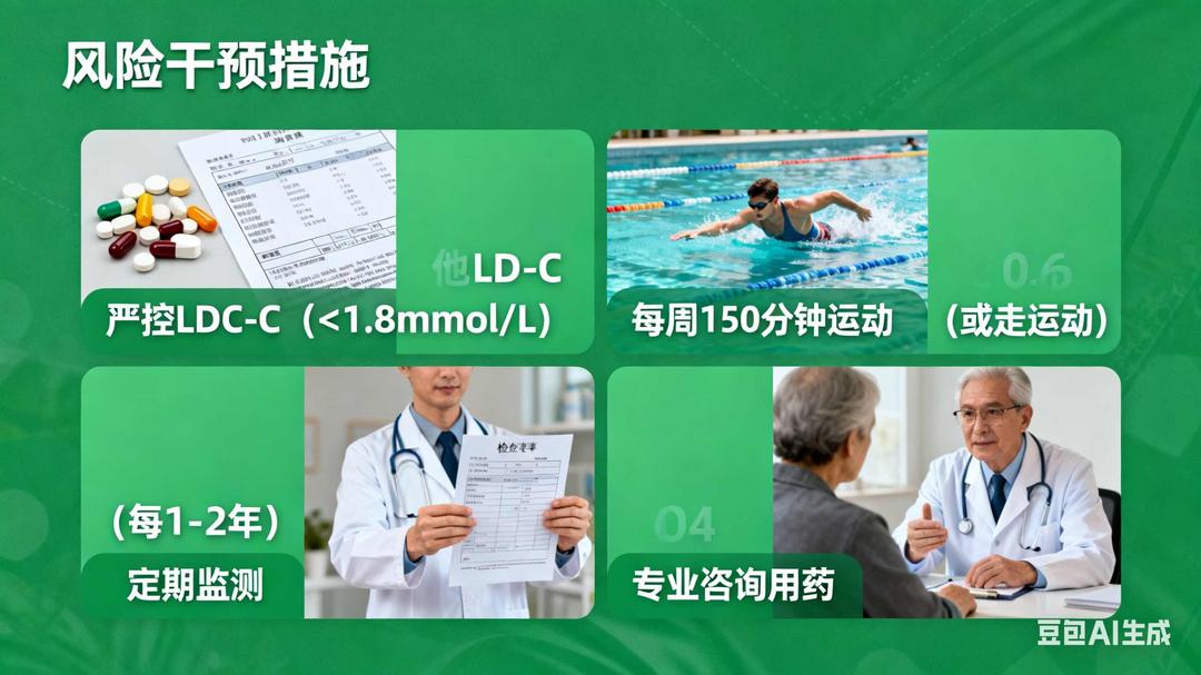 1. 严控“可控风险因素”:将坏胆固醇(LDL-C)控制在更低水平(高危人群建议<1.8mmol/L),同时管理好血压(<130/80mmHg)、血糖,戒烟限酒,避免斑块进一步恶化;