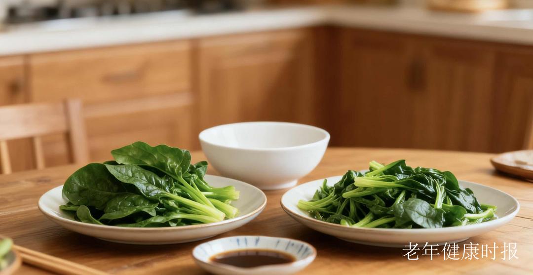 老年人吃菠菜的关键是焯水去草酸——将菠菜放入沸水焯烫30秒,既能去除影响钙吸收的草酸,又能软化纤维,让口感更易消化。推荐做法有菠菜鸡蛋汤、蒜蓉炒菠菜、菠菜拌豆腐,清淡不油腻,还能最大限度保留营养。需要注意的是,菠菜含钾量较高,肾功能不全的老年人需适量食用。